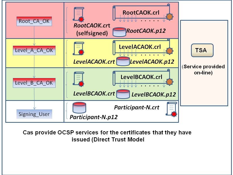- Three certification levels, with the root being Root_CA_OK, and two additional levels formed by Level_A_CA_OK and Level_B_CA_OK. This last one is the Certification Authority certifying the purported signer (entity Signing_User in the figure).